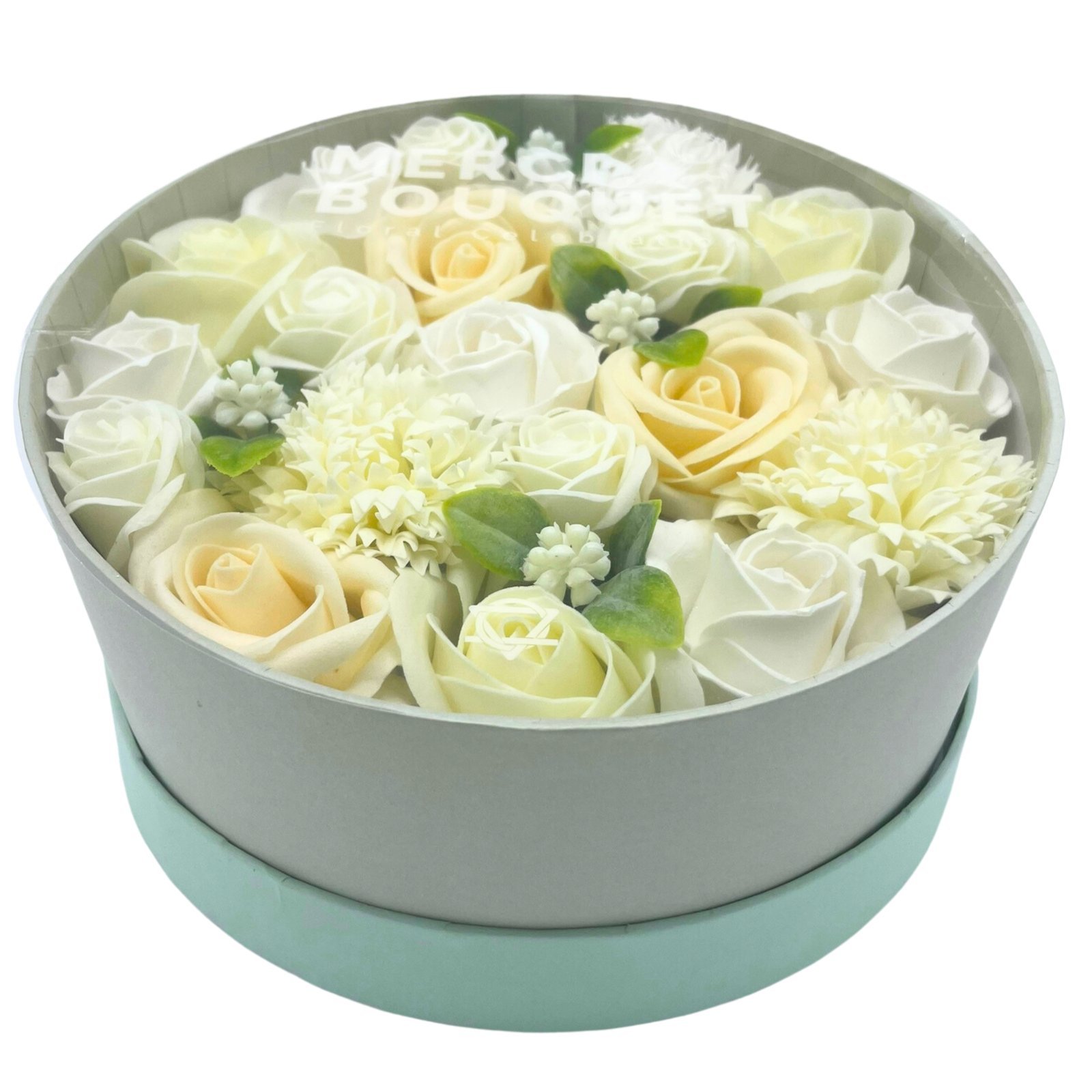 Model Okrúhly Box – Svadba – Biely & Ivory z kolekcie Sviatočných boxov z mydlových kvetov je navrhnutý tak, aby vyžaroval noblesu a symbolizoval čistotu nového začiatku. Biele a krémové mydlové kvety pôsobia luxusne, jemne a romanticky – ideálne ako dar na svadbu, výročie alebo ako elegantný spôsob, ako vyjadriť úprimné city.
